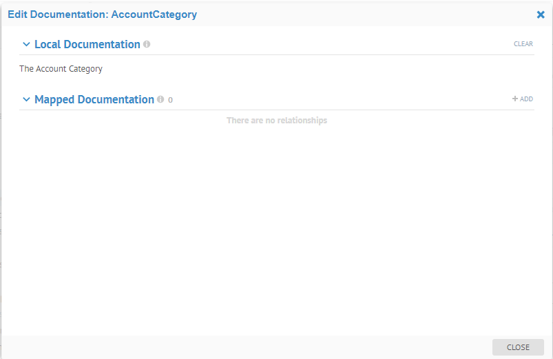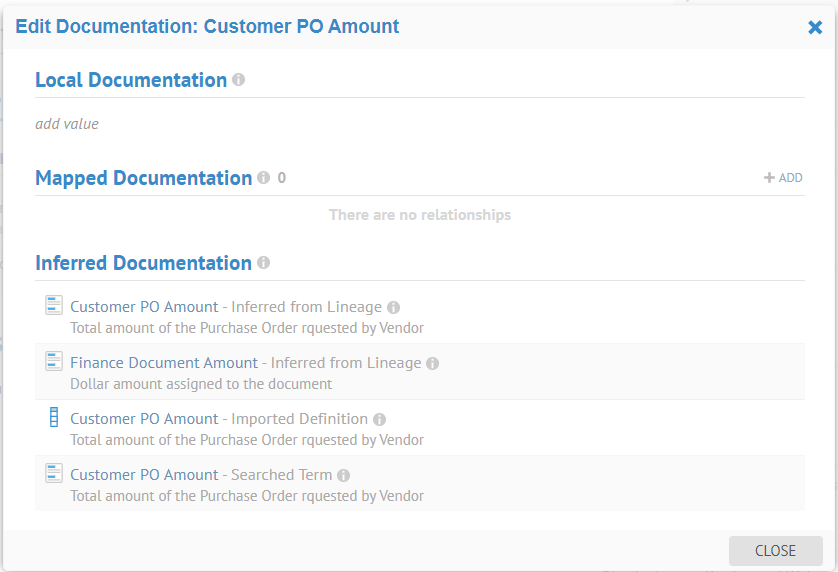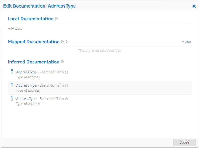 You may edit the Local Documentation directly here, create a Mapped Documentation relationship from an existing term or other object or a new one you create from this information, see the Inferred Documentation links including search matching terms if available.