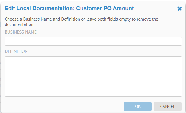 Local Documentation offers a local documentation with a business name and business description. This can be used as an alternative of the term documentation below, or a mean to supersede an existing term documentation with a better local definition.