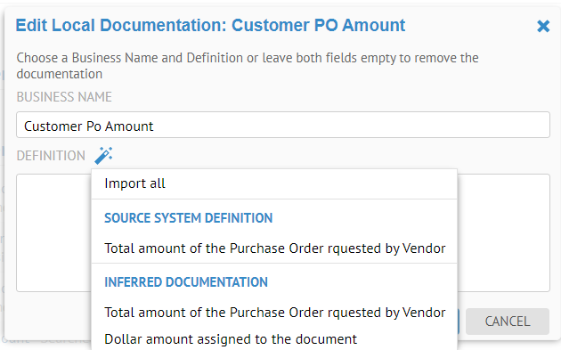 The BUSINESS DEFINITION will be pre-populated with any inferred description information.