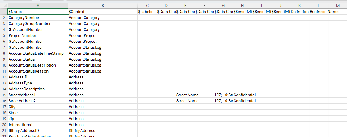 You may also enter edit the Business Name and Definition, as well as custom attributes, curation, sensitivity labes, relationships and semantic mappings by exporting to CSV or in fact XLSX format. Then you may re-import.