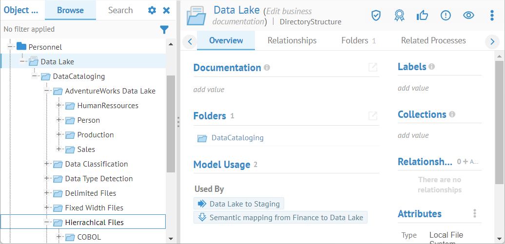 Search for the Data Lake file system model and go to its object page. Then click More actions > Show in object explorer in order to see the hierarchical structure.