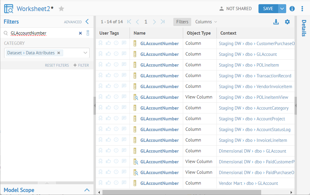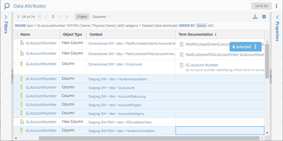 Search for the Staging DW database model and go to its object page. Then click More Actions and select Export Data Documentation to CSV/Excel.