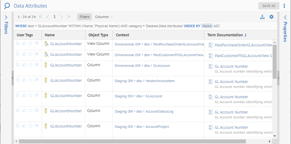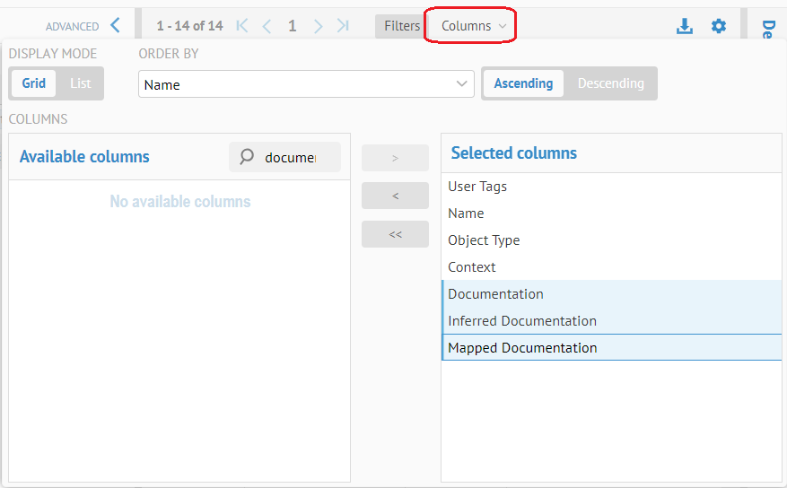 Documentation, Mapped Documentation and Inferred Documentation attributes are available in the REST API and Metadata Query Language (MQL), and therefore worksheets and dashboards allowing you to create KPI graphical widgets for the data documentation coverage.
