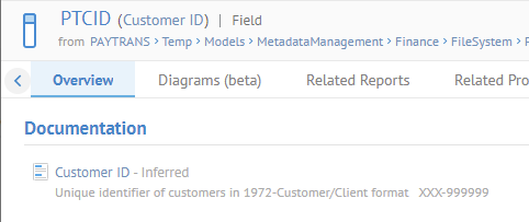 Inferred Documentation provides data documentation on any imported object automatically generated from other objects involved in its data flow pass-through lineage and impact, terms associated with data classification and/or semantic relationships. This documentation may also include the results of search in the glossary(ies) in your configuration. This is a powerful feature dramatically increasing the automatic data documentation coverage on many data stores (ODS, data lake, DW) of the Enterprise Architecture.