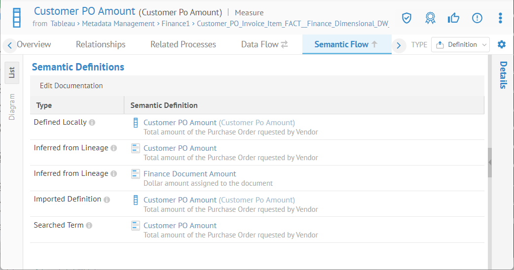 All the definitions which could be found are through inference. In this case, the data flow (pass-through, i.e. without transformation) lineage and semantic lineage trace is performed on the list of possible inferred definitions is presented.