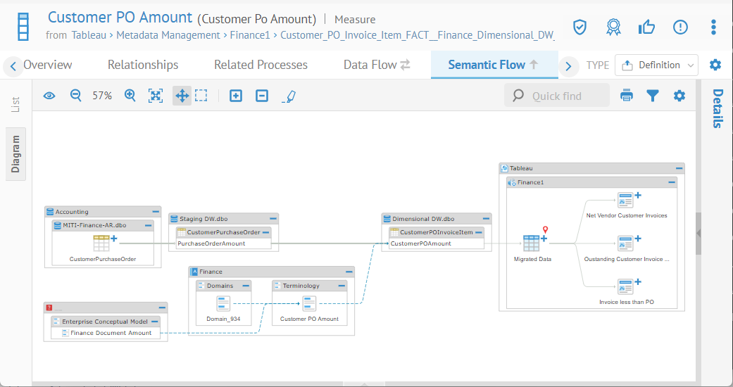 The graphical pass-through data flow and semantic lineage trace is presented.