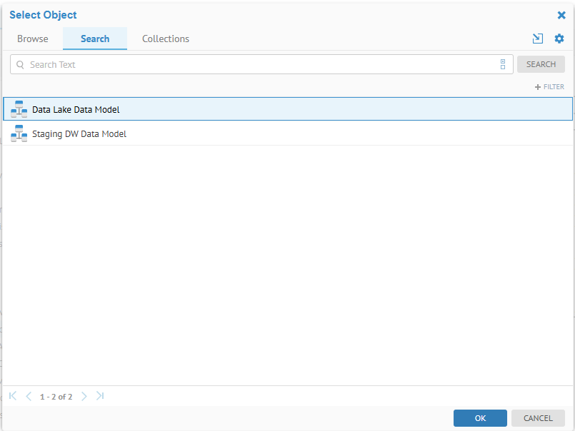 The drag and drop objects from panel on the left. It has a Search and a Browse tab and is restricted to the Model Scope defined for the data model. There are preferences for how one may see the hierarchy and also how to apply the search text, just as with the filter panel in the main search.