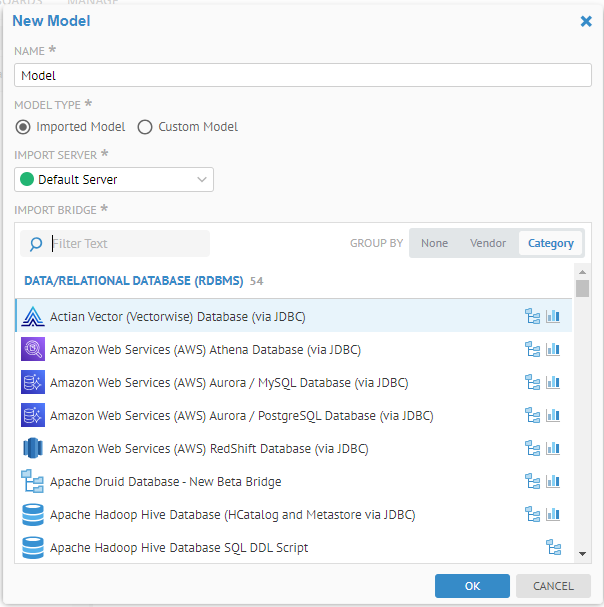 Provide a NAME for the model and pick the IMPORT BRIDGE (source technology / format to import from).