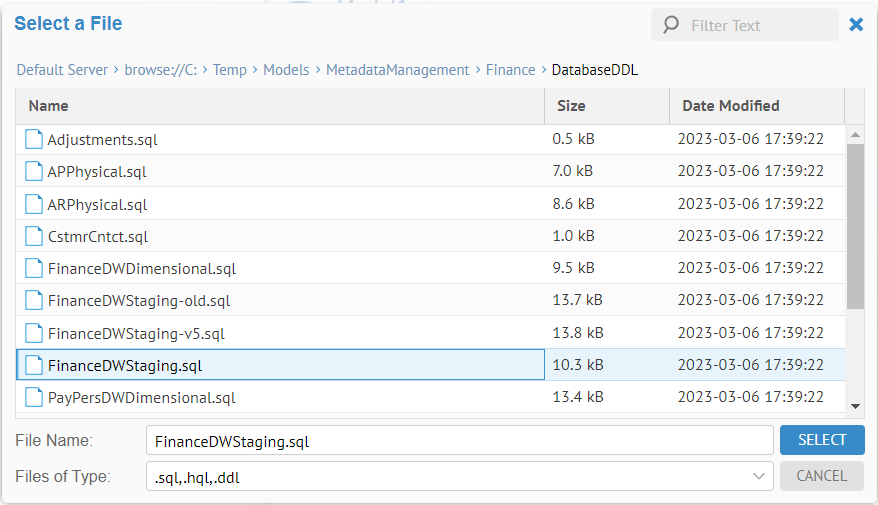 In the Import Setup tab, use the Browse icon to navigate to C:\Temp\Models\MetadataManagement\Finance\DatabaseDDL. Select the FinanceDWStaging.SQL file. Specify "dbo" as the Default Schema. Be sure to click Save.