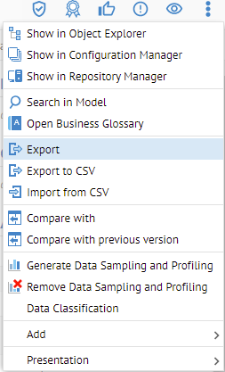 Models imported from databases are now multi-model (one model per schema in Oracle, or per database in a SQL Server), therefore the export menu (e.g. to a BI tool like Tableau) is only available on the object page for the database schema More Actions menu in the upper right.