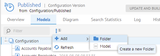 Just as you may define configurations for automatic update of new model versions which are contained in that configuration, you may use the Update and build option to do so manually. In this way, for each contained model, the latest version is included in the configuration. Then the configuration is Built as part of the process.