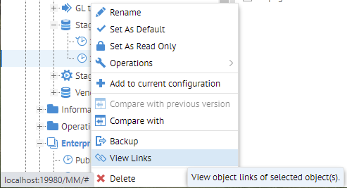 Right-click on the second version of the Staging DW model and select View Links and note that it is not a member of any configuration version and is thus a candidate to be purged.