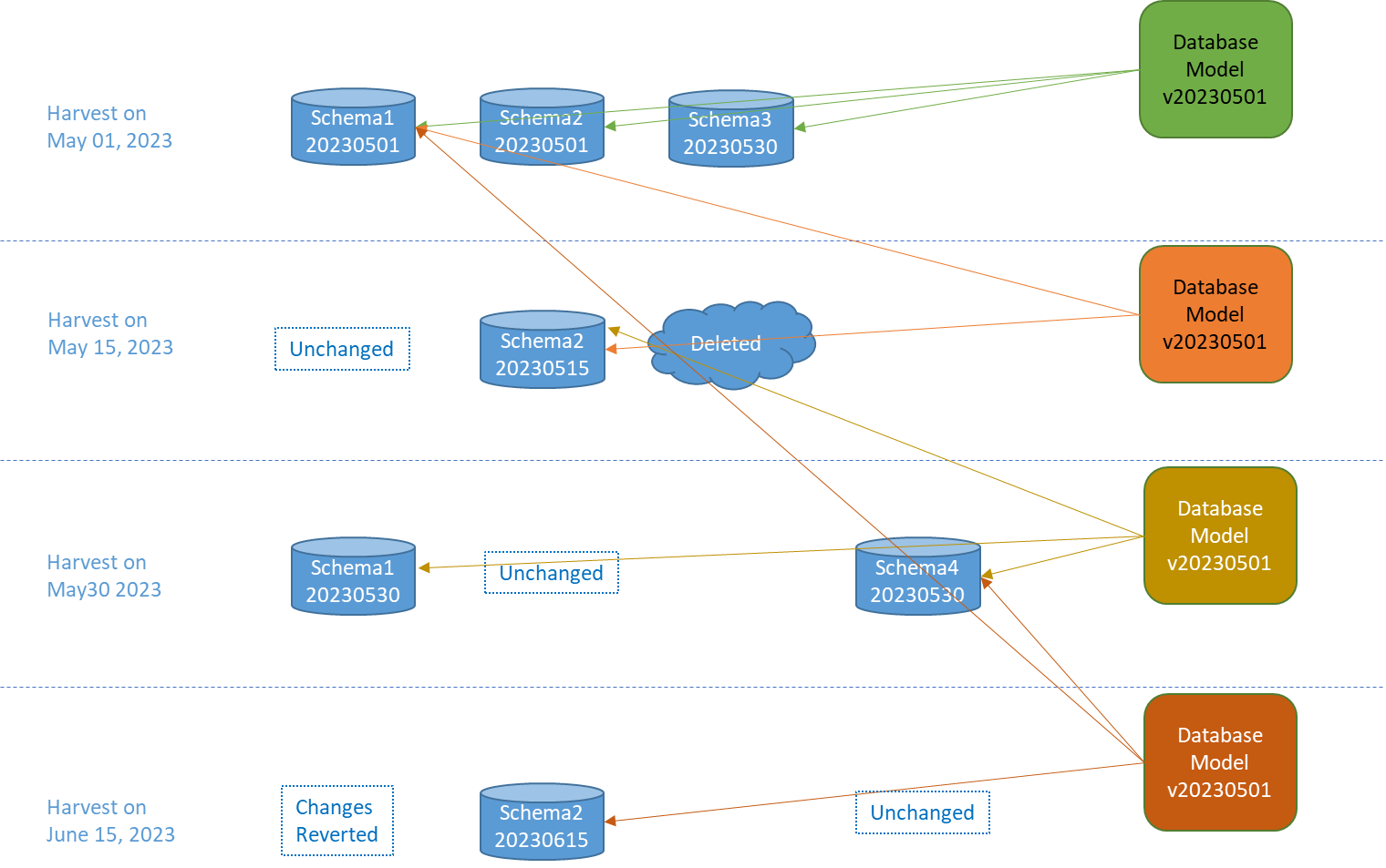 For example, in the picture above, we have four different harvests of an imported model (a relational database in this illustration), and only some of the schemas prove to be updated at each harvest.