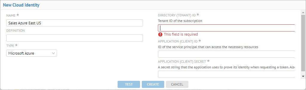 Pick Sales Azure East US as the CLOUD IDENTITY.