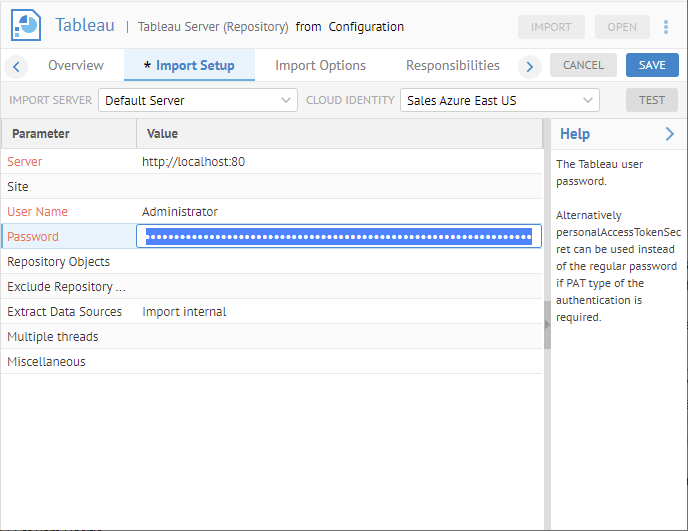 The metadata harvesting (model import) is performed by server (see MANAGE > Servers) that may use allowing secret / password parameters to be based on an external (EWP managed) cloud identity (on Amazon Web Services, Google Cloud, or Microsoft Azure) where the secret / password parameter can be: