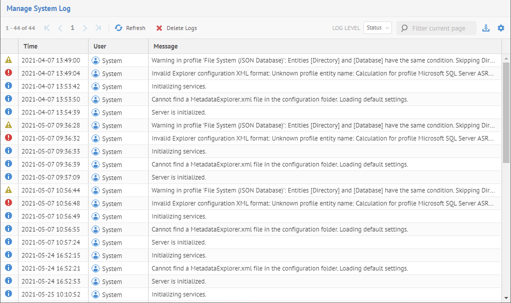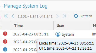 Log messages are printed with the Server time, which may be obtained by going to MANAGE > System.