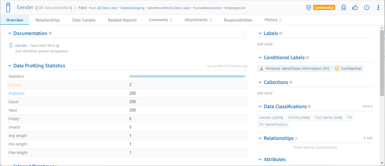 That information is then available when one navigates to the file or table's object page or when looking at individual fields or columns from the file or table. The application can store and display the following data profiling details for table/view and column objects: