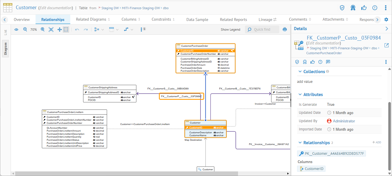 In this case we will navigate to the object page of the Customer table in the Staging DW database model, and click the Relationships tab.