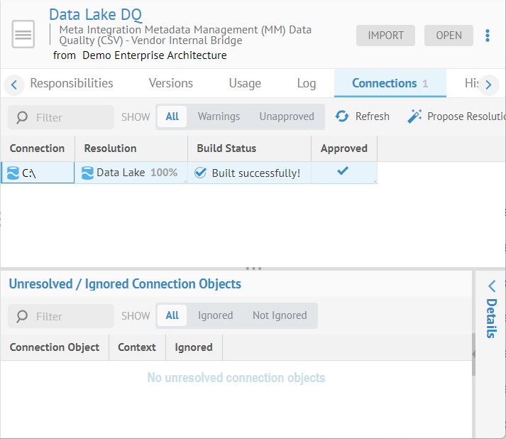 In this case, we we already imported using the Meta Integration Data Quality import bridge. The data quality information is to be associated with the the Data Lake file system file based imported model. The Data Lake model is already imported and in the configuration and all we need to do is stitch them.