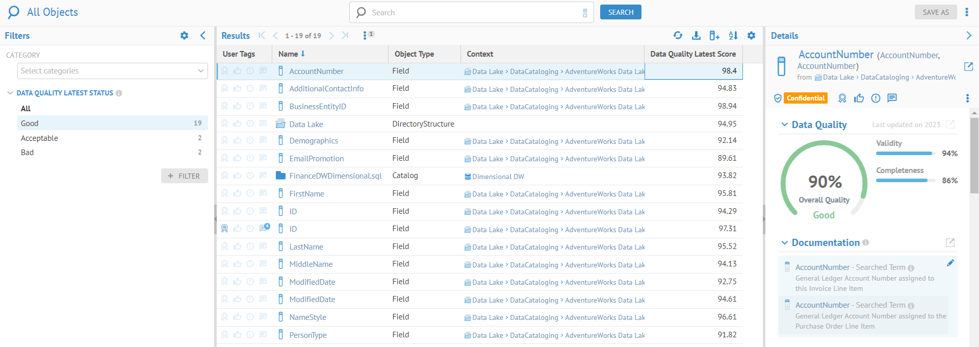 Now that the data quality information is associated (through stitching) to the Data Lake metadata, we can see that information for specific columns.