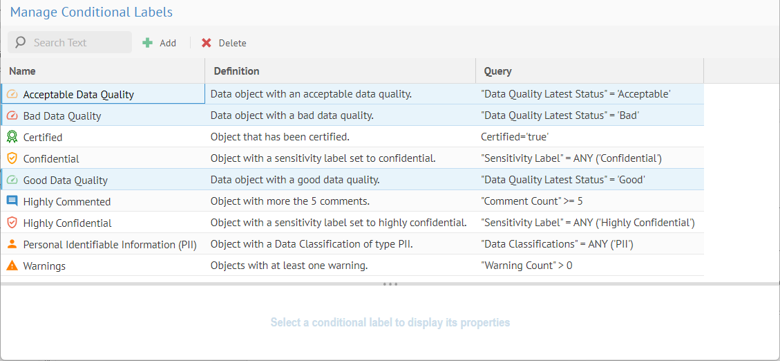 Conditional labels may be defined for Data Quality Status and other properties. Three are pre-defined: