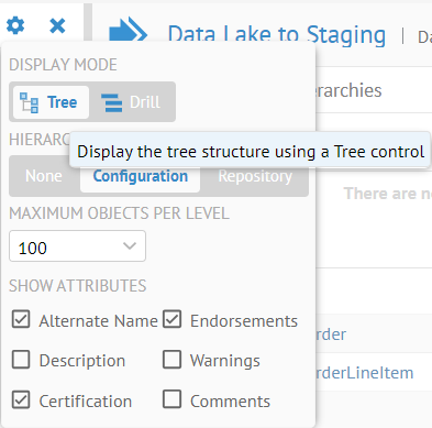 When presented with this limited view, you may Pin to a level in the tree. For example, you can search for the level object, navigate to it by drilling up or down.