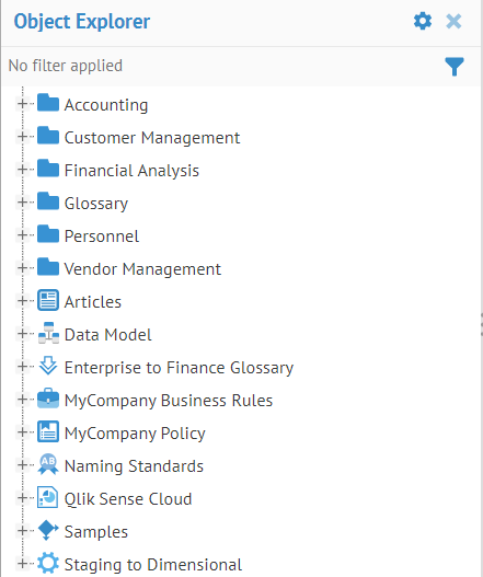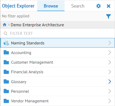 The Object Explorer panel is a UI feature of EWP which emphasizes navigation using various organizational structures presented as a tree, asset of flat search results or collections of objects.