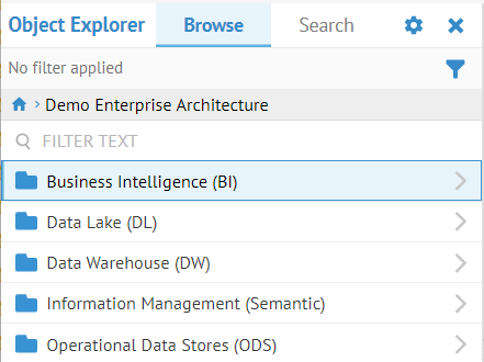 You may specify a persona (e.g., All Objects or Data Inventory) in the pull-down to the left of the search box to set the basis or scope with initial filtering of objects in the explore tree.
