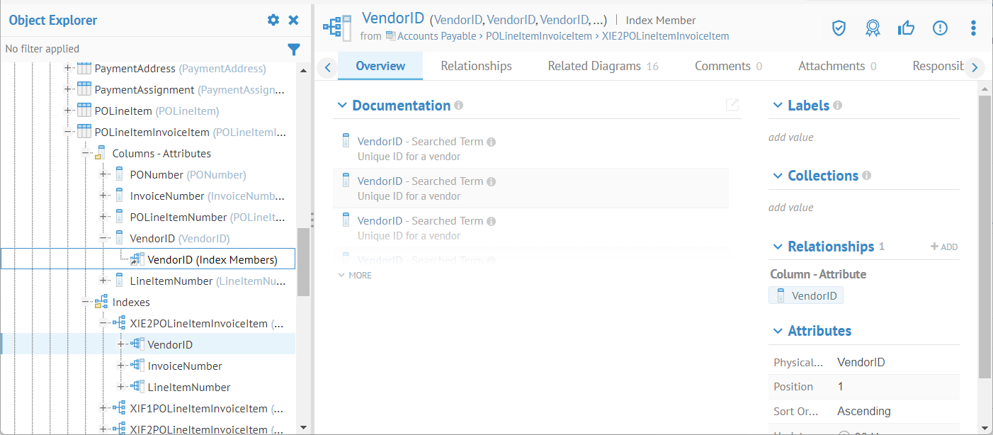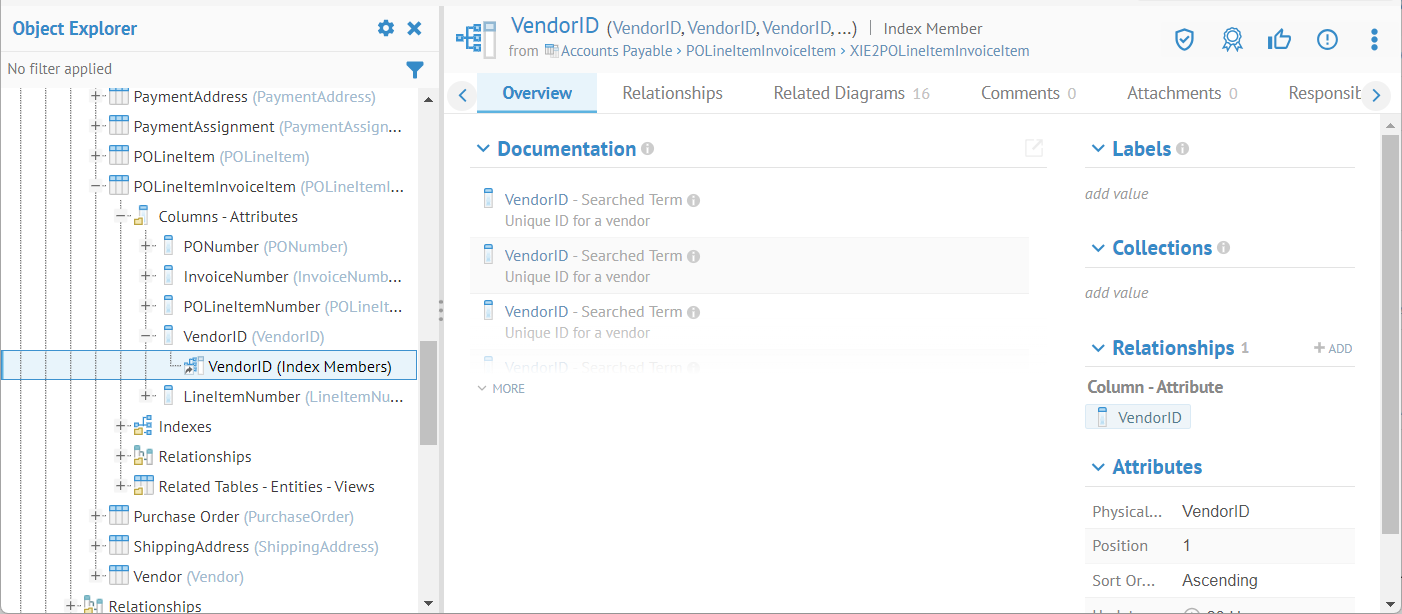 Navigate in the tree or drill-down to Glossary > Accounts Payable > POLineItemInvoiceItem > VendorID > VendorID reference (hyperlink):