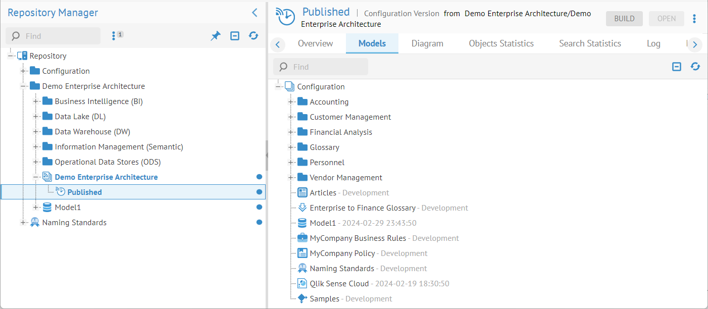 Repository -- Displays the tree using the structure of folders and models defined in the repository.