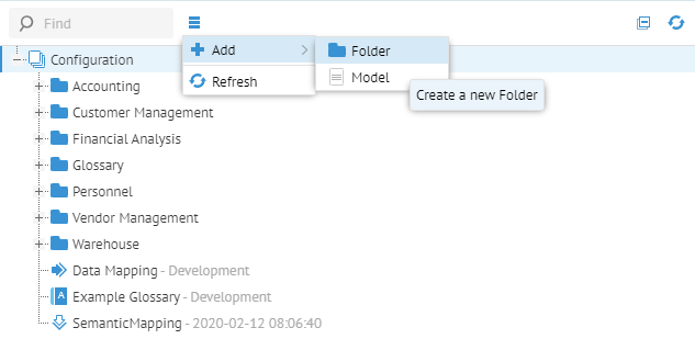 Note, there is already a structure. Right-click the root of the tree (Configuration) then select Add, then Folder and name it "Warehouse".