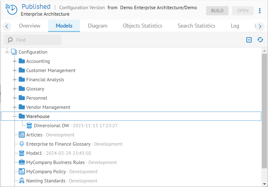 Configuration -- Displays the tree using the structure of folders and models defined in the configuration itself.
