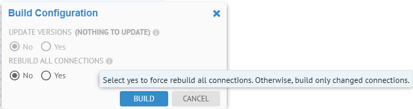 In this case, there is only one version of each of these models, so the UPDATE VERSIONS option is moot. However, click Yes for REBUILD ALL CONNECTIONS. Then click BUILD and refresh the browser.