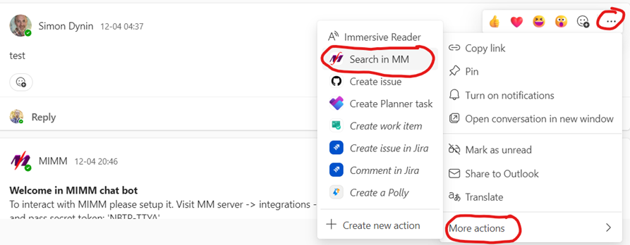 The message context menu contains a Search in MM action which searches by message text. The Message context menu may be opened using the context menu.