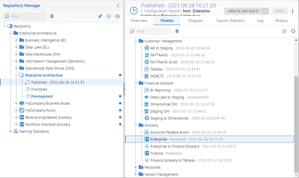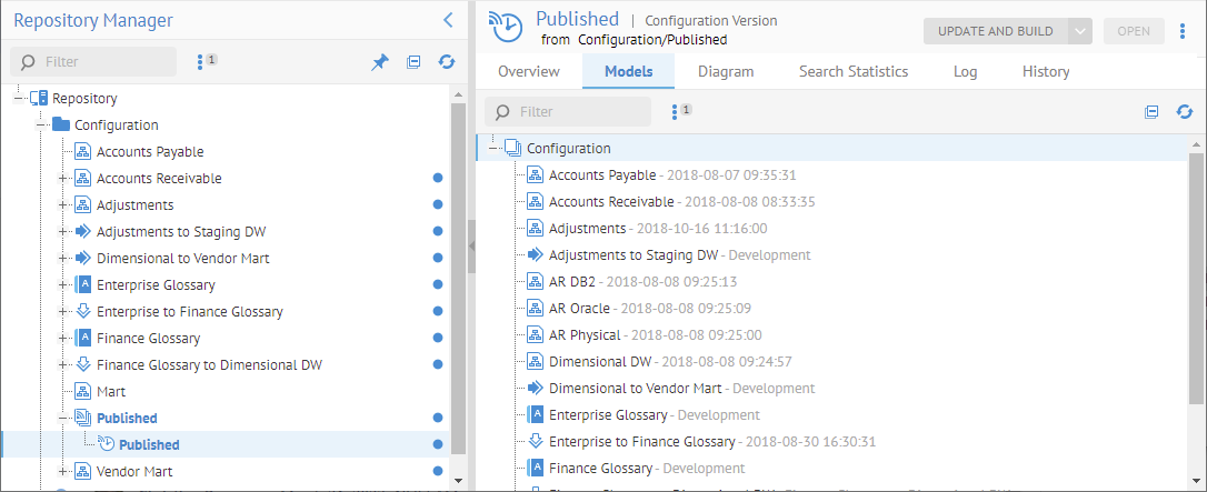 Just as you may define configurations for automatic update of new model versions which are contained in that configuration, you may use the Update and build option to do so manually. In this way, for each contained model, the latest version is included in the configuration. Then the configuration is Built as part of the process.