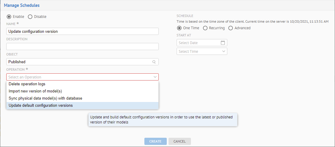 Automatically on Manage > Schedules > Operation or the REST API to import a model > never update/build any configuration