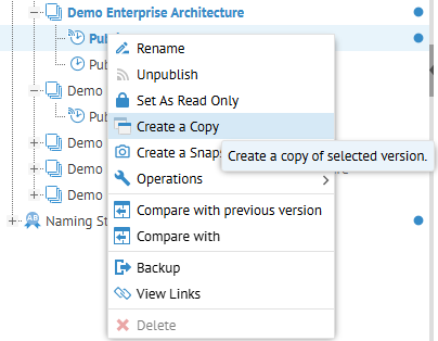 Sign in Administrator and go to MANAGE > Repository. Right-click the Published version of the Demo Enterprise Architecture configuration and select Create a Copy.