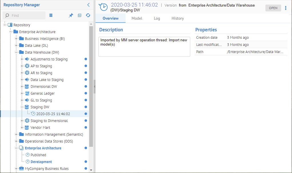 Now, go back to the Repository Manager tree, right-click on the Staging DW model and select Open to go to the object page for the model (internal).
