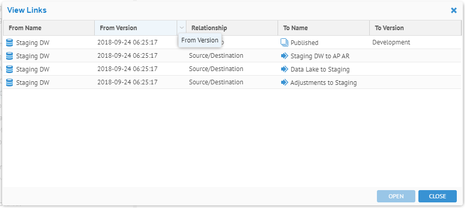 Right-click on the second version of the Staging DW model and select View Links and note that it is not a member of any configuration version and is thus a candidate to be purged.